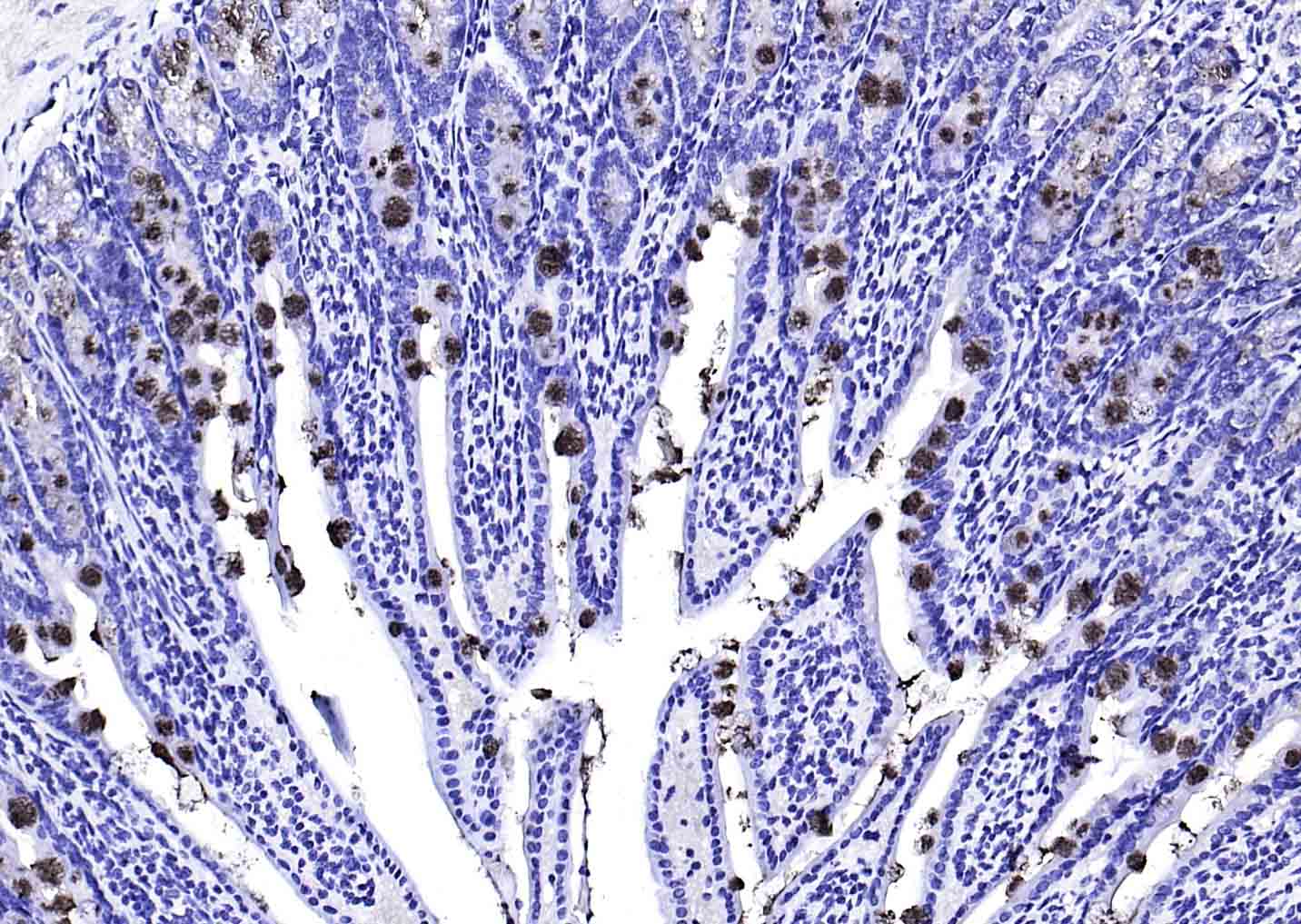 Paraformaldehyde-fixed, paraffin embedded (Mouse small intestine); Antigen retrieval by boiling in sodium citrate buffer (pH6.0) for 15min; Block endogenous peroxidase by 3% hydrogen peroxide for 20 minutes; Blocking buffer (normal goat serum) at 37°C for 30min; Antibody incubation with (TFF3 ) Polyclonal Antibody, Unconjugated (bs-0535R) at 1:200 overnight at 4°C, followed by operating according to SP Kit(Rabbit) (sp-0023) instructionsand DAB staining.
