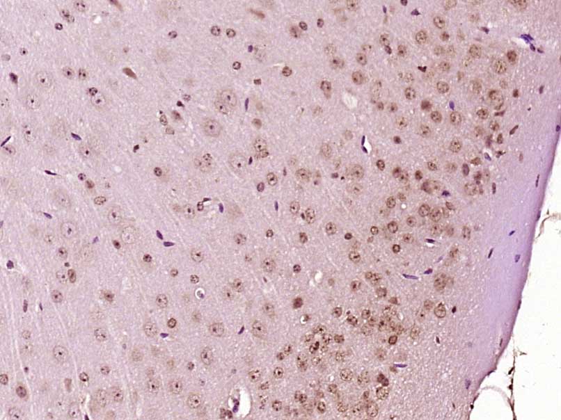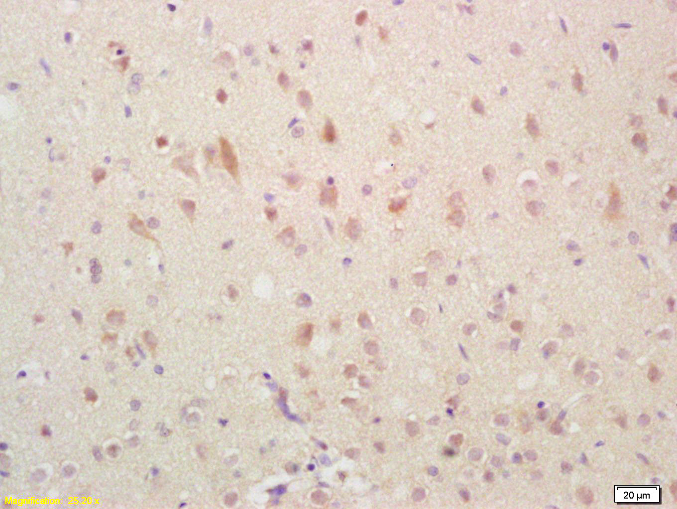 Paraformaldehyde-fixed, paraffin embedded (Mouse brain); Antigen retrieval by boiling in sodium citrate buffer (pH6.0) for 15min; Block endogenous peroxidase by 3% hydrogen peroxide for 20 minutes; Blocking buffer (normal goat serum) at 37°C for 30min; Antibody incubation with (GADD45) Polyclonal Antibody, Unconjugated (bs-1360R) at 1:400 overnight at 4°C, followed by operating according to SP Kit(Rabbit) (sp-0023) instructionsand DAB staining.
