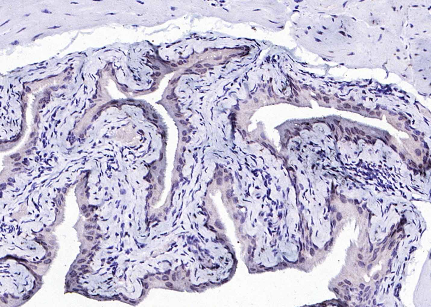 Paraformaldehyde-fixed, paraffin embedded (Mouse bladder); Antigen retrieval by boiling in sodium citrate buffer (pH6.0) for 15min; Block endogenous peroxidase by 3% hydrogen peroxide for 20 minutes; Blocking buffer (normal goat serum) at 37°C for 30min; Antibody incubation with (IKK beat) Polyclonal Antibody, Unconjugated (bs-3233R) at 1:200 overnight at 4°C, followed by operating according to SP Kit(Rabbit) (sp-0023) instructionsand DAB staining.