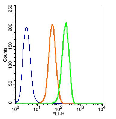 Blank control(blue):293T Cells(fixed with 2% paraformaldehyde (10 min) and then permeabilized with ice-cold 90% methanol for 30 min on ice). Primary Antibody: Rabbit Anti-5HT3B receptor Phospho-c-Fos (Thr325)/AF488 Conjugated antibody (bs-4289R-AF488), Dilution: 1ug in 100 ul 1X PBS containing 0.5% BSA; Isotype Control Antibody: Rabbit IgG/AF488(orange) ,used under the same conditions.