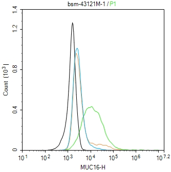 The OVCAR-3 (H) cells were incubated in 5%BSA to block non-specific protein-protein interactions (30 min at r.t.). Primary Antibody (green): Mouse Anti-MUC16 antibody (bsm-43121M): 1 μg/10^6 cells; Secondary Antibody (white blue): Goat anti-Mouse IgG-BF488 (bs-60296G-BF488): 1 μg/test. Isotype Control (orange): Mouse IgG (bs-0296P). Blank control (black): PBS. Acquisition of 20,000 events was performed.